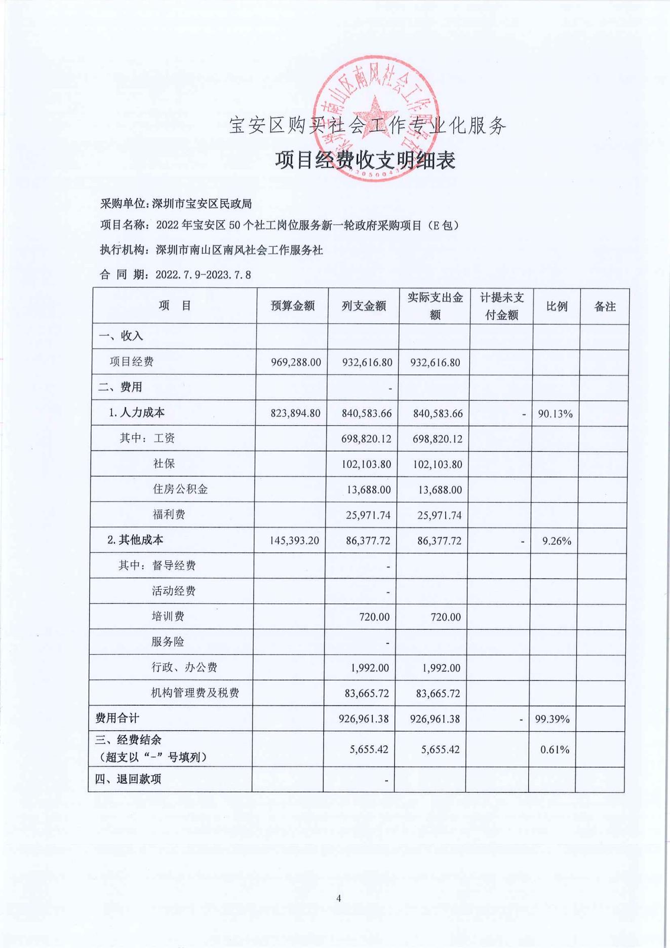 宝安区购买社会工作专业化服务项目经费收支明细表