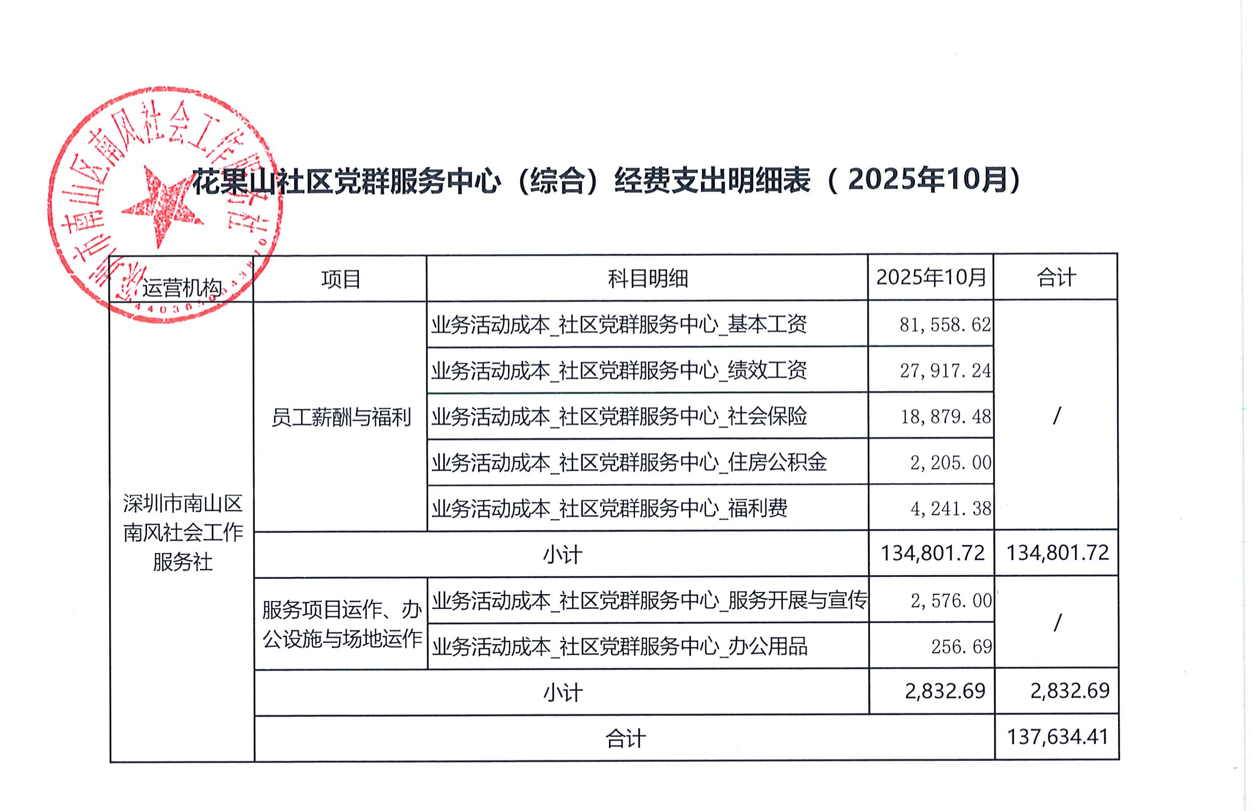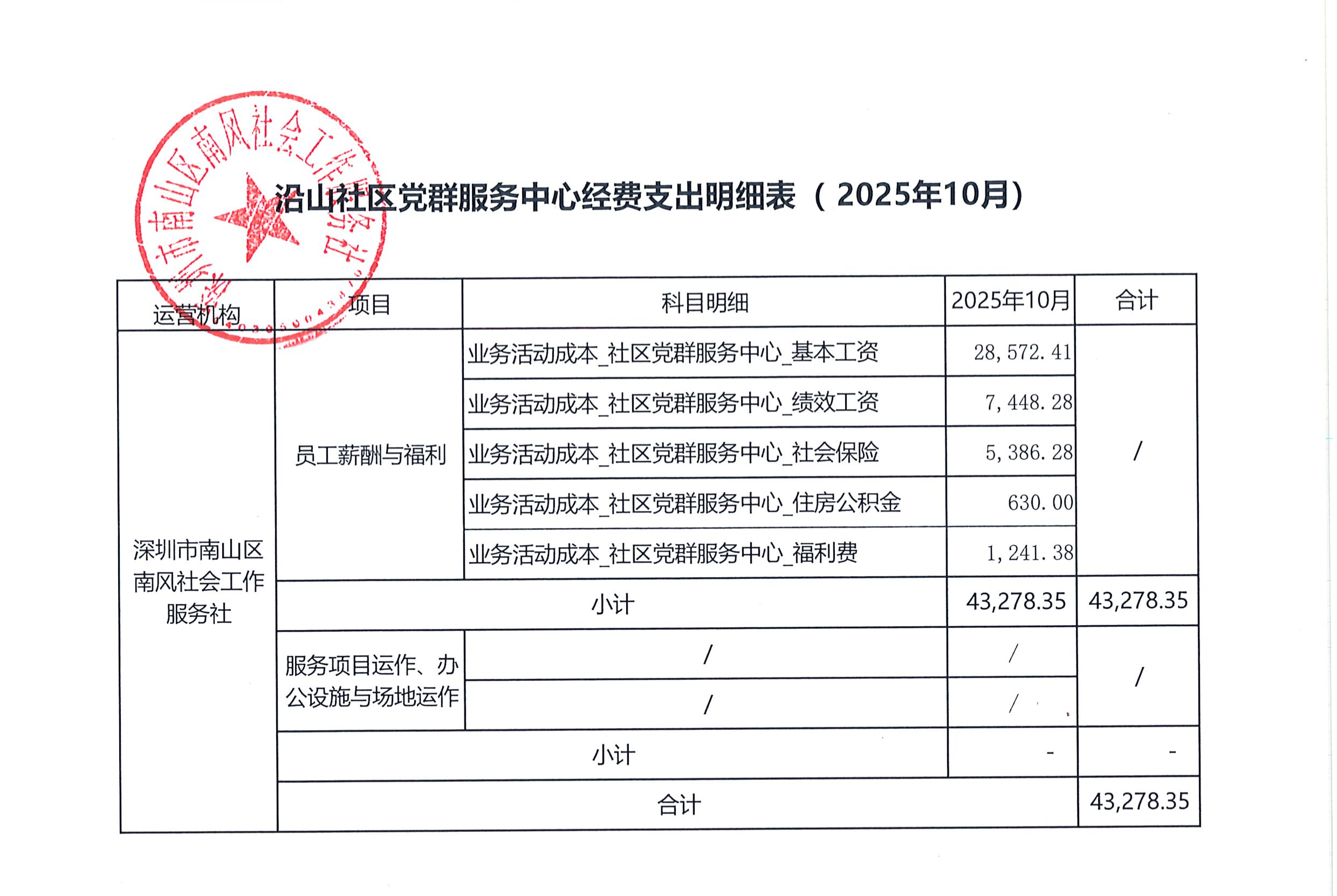 深圳市南山区南风社会工作服务社2025年10月共运营南山区招商街道社区党群服务中心6个:文竹园、桃花园、海月、水湾、沿山、花果山社区党群服务中心政府购买项目,现进行季度财务情况公示。以下为招商街道7中心2025年10月财务情况: