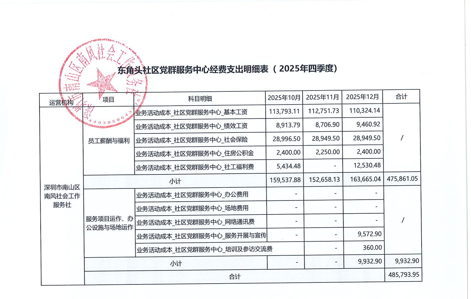 深圳市南山区南风社会工作服务社2025年第三季度共运营南山区蛇口街道社区党群服务中心12个:渔一、渔二、湾厦、海湾、海滨、雷岭、南水、大铲、海昌、围仔、深圳湾、东角头社区党群服务中心政府购买项目,现进行季度财务情况公示。以下为蛇口街道12中心2025年第三季度财务情况: